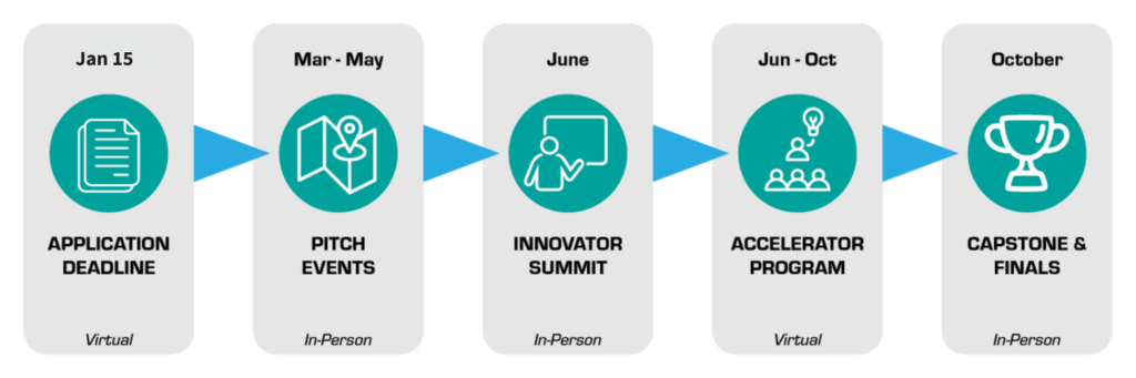 Companies accepted to the program must commit a (co-)founder, chief executive officer, or appropriate senior member of their leadership team to participate in the four-month virtual accelerator program and be present for the Capstone Event showcase and finals in October.